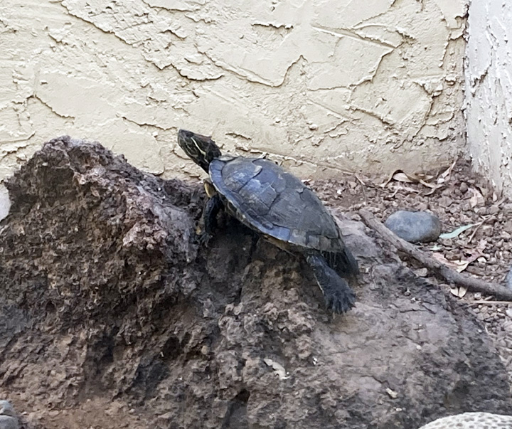 Another view of Baby Turtle in Oct 2007. She didn’t inherit her father’s unsymmetrical markings on the underside of his shell for which Mr. Turtle was originally called One Spot.